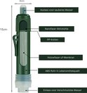 Contenu de la livraison : 1 x filtre à eau, 1 x tube d'extension, 1 x sac à eau portable, 1 x sangle de suspension, 1 x manuel d'utilisation (français non garanti). Astuce : ce filtre à eau ne convient pas à l'eau de mer et à l'eau traitée chimiquement.