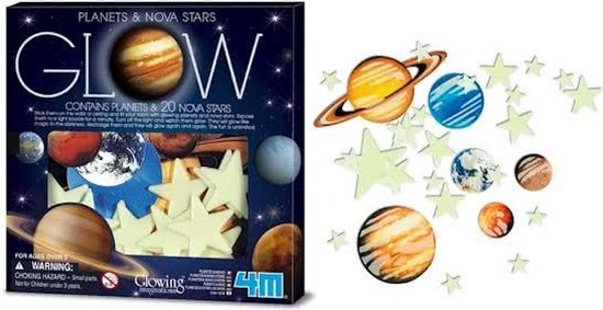 4M Phosphorescent Nova Planets & Supernova est un ensemble amusant avec 9 planètes lumineuses et 20 étoiles lumineuses. Comment donnent-ils de la lumière? Baignez les étoiles et les planètes dans la lumière pendant 1 minute. Éteignez la lumière et vous les verrez briller! Toutes les formes contiennent un tissu spécial qui peut être chargé à plusieurs reprises à la lumière. Accrochez-les au plafond de votre chambre et vous dormirez sous un beau ciel étoilé!