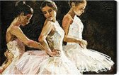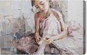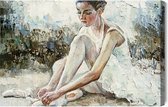 Painting King – Peinture sur toile Petite ballerine aux cheveux bouclés assise et attache des chaussures de pointe. Peinture à l'huile, technique du couteau à palette et pinceau. - 100 x 70 cm