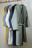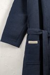La structure gaufrée du tissu est particulièrement douce sur la peau et n'est pas collante, ce qui garantit une expérience confortable. Le peignoir comporte deux poches plaquées pratiques et une ceinture, ainsi qu'une boucle dans le col pour l'accrocher facilement.
