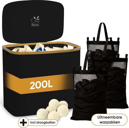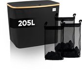 Panier à linge Premium 3 compartiments XXL - 200 L - Trieur de linge - Panier à linge avec couvercle - Avec 3 sacs amovibles - Zwart - Boutons - Boules de séchage incluses
