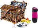 4 verres à champagne, poignées confortables, cordon, 4 assiettes en faïence et ensemble de couverts en acier inoxydable avec poignée en plastique pour 4 personnes. Comprend maintenant un thermos rose!