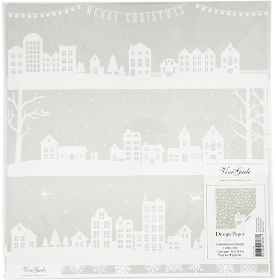 Papier design, feuille 30,5x30,5 cm, 180 gr, maisons et flocons de neige, 3 feuilles