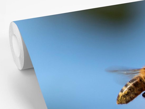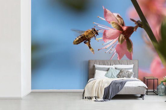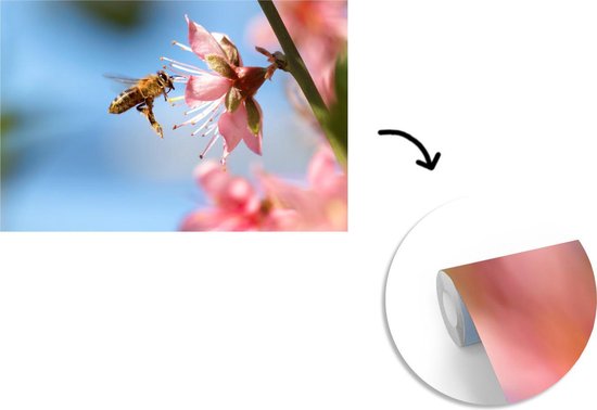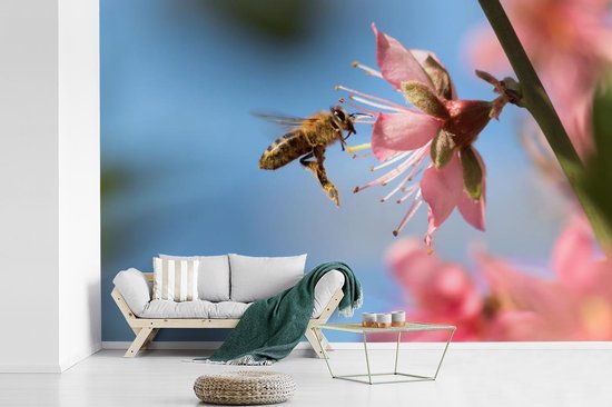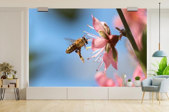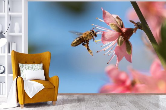 Papier peint Papier peint photo en vinyle - Abeille volant vers une fleur rose largeur 420 cm x hauteur 280 cm - Tirage photo sur papier peint (disponible en 7 tailles)