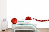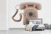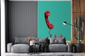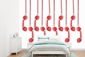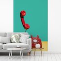 Papier peint - Papier peint Un téléphone rétro rouge sur fond jaune devant un Papier peint photo végétal - Largeur 200 cm x hauteur 300 cm