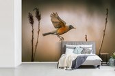 Papier peint photo en vinyle - Petit roseau fauvette assis verticalement dans le roseau largeur 420 cm x hauteur 280 cm - Tirage photo sur papier peint (disponible en 7 tailles)