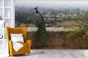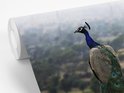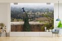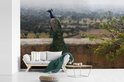 Papier peint photo en vinyle - Un paon vert face à la nature depuis un mur de pierre largeur 600 cm x hauteur 400 cm - Tirage photo sur papier peint (disponible en 7 tailles)