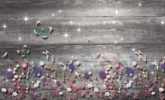 Papier peint photo Peint Intissé - Fleurs et Papillons sur Planches - Art - 254 x 184 cm