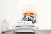 Behang - Fotobehang Theekop - Bladeren - Blauw - Breedte 330 cm x hoogte 220 cm