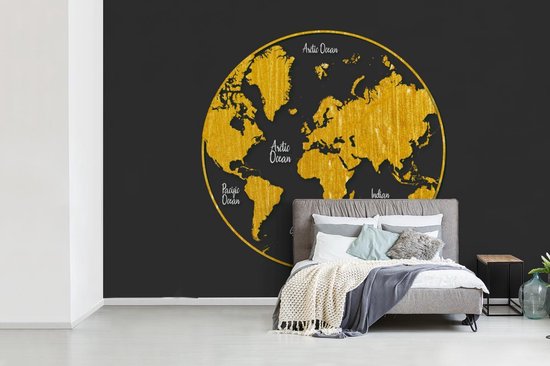 Papier peint vinyle - Carte du monde ronde et dorée sur fond gris largeur 450 cm x hauteur 300 cm - Tirage photo sur papier peint (disponible en 7 tailles)
