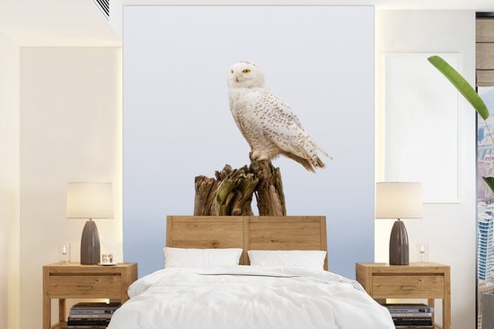 Papier peint vinyle - Harfang des neiges est assis sur un tronc d'arbre noueux largeur 160 cm x hauteur 220 cm - Tirage photo sur papier peint (disponible en 7 tailles)
