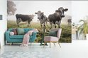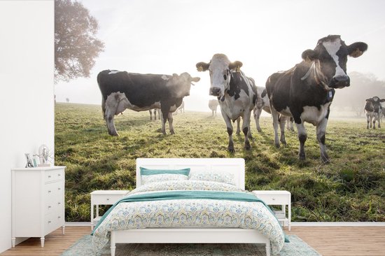Papier peint vinyle - Un matin brumeux avec les vaches frisonnes dans le pâturage largeur 330 cm x hauteur 220 cm - Tirage photo sur papier peint (disponible en 7 tailles)