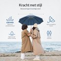 Il est facile de le plier et de le déplier avec le bouton. Cependant, vous devez ensuite le "tendre" à nouveau pour qu'il rentre dans le boîtier et soit prêt pour la prochaine fois. Ce qui ressort vraiment, c'est qu'il sèche immédiatement après utilisation, il suffit de le secouer et c'est vraiment incroyable. Je n'ai (heureusement) pas pu tester s'il pouvait supporter des vents allant jusqu'à 108 km/h, mais il semble très solide et robuste.