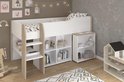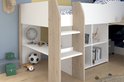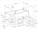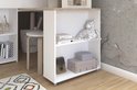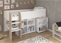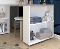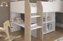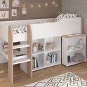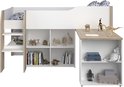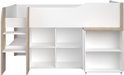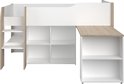 Lit Moscon en blanc avec des accents en décor chêne Jackson. Le lit est composé une surface de couchage, un bureau à roulettes et une armoire intégrée avec des compartiments de rangement ouverts. Spécifications