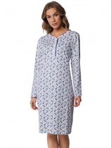 La chemise de nuit est de couleur blanche avec un imprimé graphique bleu foncé. La chemise de nuit a des manches longues et une longueur de 100 cm en taille 38. La chemise de nuit a une encolure ronde avec un petit V découpé qui se termine par une fermeture à bouton.