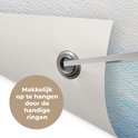 Les Posters de jardin, également appelées toiles de jardin, sont des affiches spécialement conçues pour être accrochées à l'extérieur. Cette nappe de jardin peut donc prendre une raclée. La voile Bisonyl a été utilisée pour cette affiche extérieure. Cette voile est une bâche enduite avec une belle finition. L'affiche de jardin est résistante aux UV, elle ne se décolore donc pas au soleil. Plusieurs anneaux ont été placés dans la toile pour que vous puissiez facilement l'accrocher! Jusqu'à une taille de 120x80 cm, les anneaux sont dans les coins, avec des tailles plus grandes, les anneaux viennent tous les 60 cm. Le tissu résiste aux différentes influences climatiques et est garanti 3 ans.