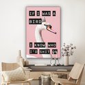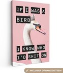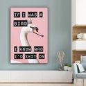 Une illustration sereine d’un cygne avec une simple couronne, placé sur un fond rose. Le texte « SI J'ÉTAIS UN OISEAU, JE SAIS SUR QUI JE CHIE » ajoute une ironie ludique au cygne gracieux.