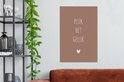 Le dicton néerlandais « Récoltez le bonheur » sur fond rose foncé.