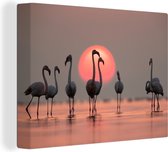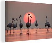 Amenez votre intérieur à un niveau supérieur avec cette toile ! Sur cette toile, un groupe de flamants roses se tient devant un soleil couchant.