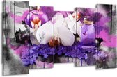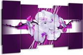 Peinture sur toile Orchidée | Violet, bleu, blanc | 150x80cm 5Liège. Cette peinture sur toile fait partie de la collection GroepArt et c'est un moyen simple et rapide de transformer complètement n'importe quel mur! Nos peintures sur toile contiennent de belles images imprimées sur du matériel en toile, tendues sur un cadre en bois. Cette peinture est disponible en 45 tailles sur notre site Internet. Personnalisation possible! Cette peinture sur toile mesure. Incl. jeu de suspension (à confirmer par vous-même). Le paquet contient 5 panneaux de peinture, manuel, jeu de suspension, protégé par du papier bulle, emballé dans une boîte solide.