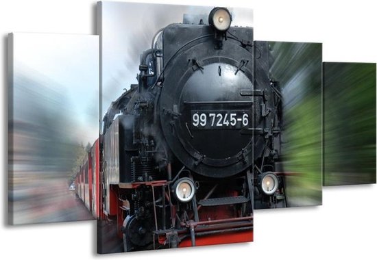 Peinture sur toile Train | Noir, vert, gris | 160x90cm 4 Liège. Cette peinture sur toile fait partie de la collection GroepArt et c'est un moyen simple et rapide de transformer complètement n'importe quel mur! Nos peintures sur toile contiennent de belles images imprimées sur du matériel en toile, tendues sur un cadre en bois. Cette peinture est disponible en 45 tailles sur notre site Internet. Personnalisation possible! Cette peinture sur toile mesure. Incl. jeu de suspension (à confirmer par vous-même). Le paquet contient 4 panneaux de peinture, manuels, suspendus, protégés par du papier bulle, emballés dans une boîte solide.