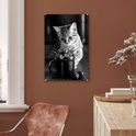Tableau sur verre - Chat assis près d'une tasse remplie de cerises - noir et blanc - Salon - Chambre
