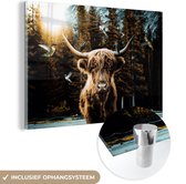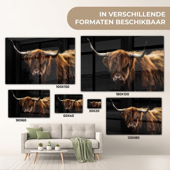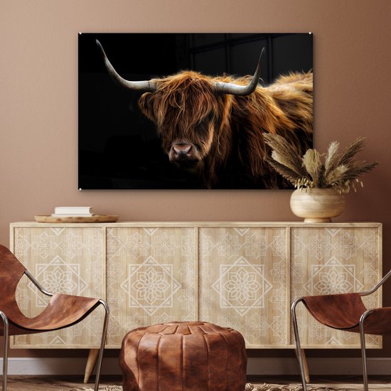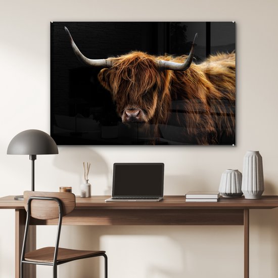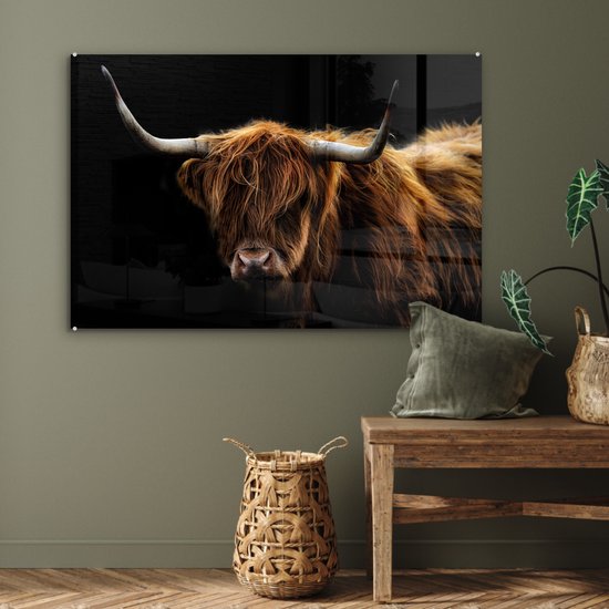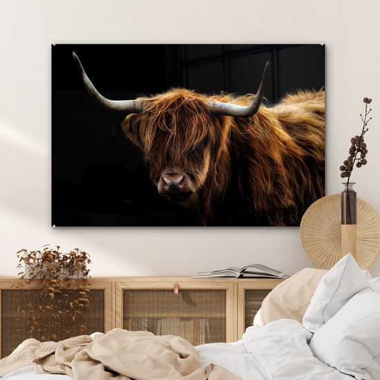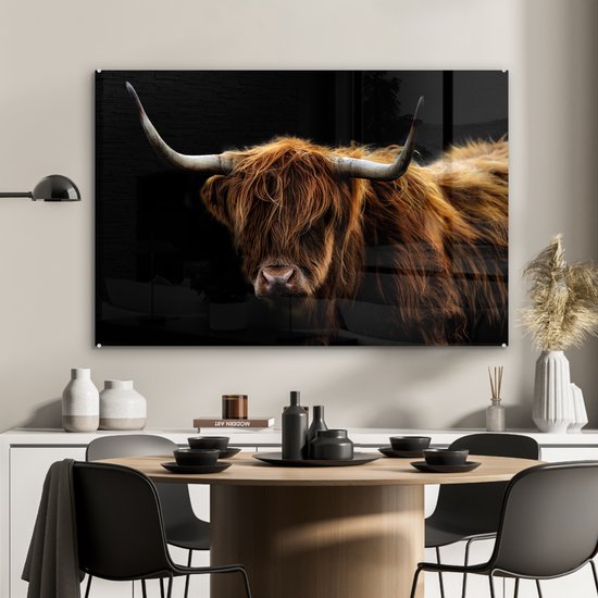 Peinture sur verre Highlander écossais - Cornes - Zwart - Animaux - Vache - Salon - 120x80 cm - Photo sur verre - Décoration murale verre - Décoration chambre - Plaque de verre - Décoration murale