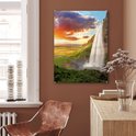 Un immense plan d'eau plonge des rochers, formant une cascade. Derrière la cascade se trouve un coucher de soleil qui colore le ciel en orange. Donnez un coup de fouet à l'intérieur de votre salon, chambre ou bureau avec cette photo sur verre !