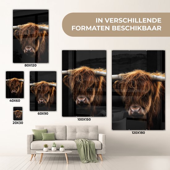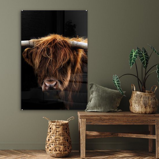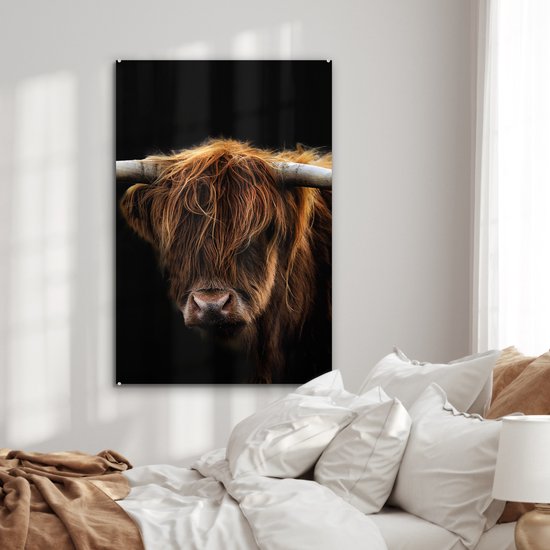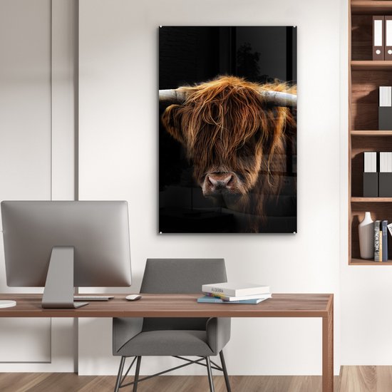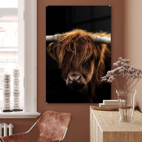 Peinture sur verre Scottish Highlander - Cornes - Zwart - Animaux - Vache - Salon - 80x120 cm - Photo sur verre - Décoration murale verre - Décoration chambre - Plaque de verre - Décoration murale