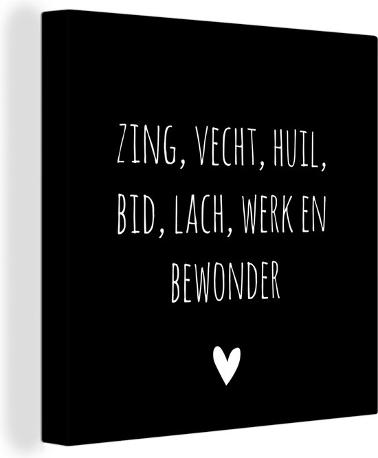 Peintures sur toile - Citations - Citation néerlandaise : « Chantez, combattez, pleurez, priez, riez, travaillez et admirez » sur fond noir - 20x20 cm - Décoration murale