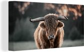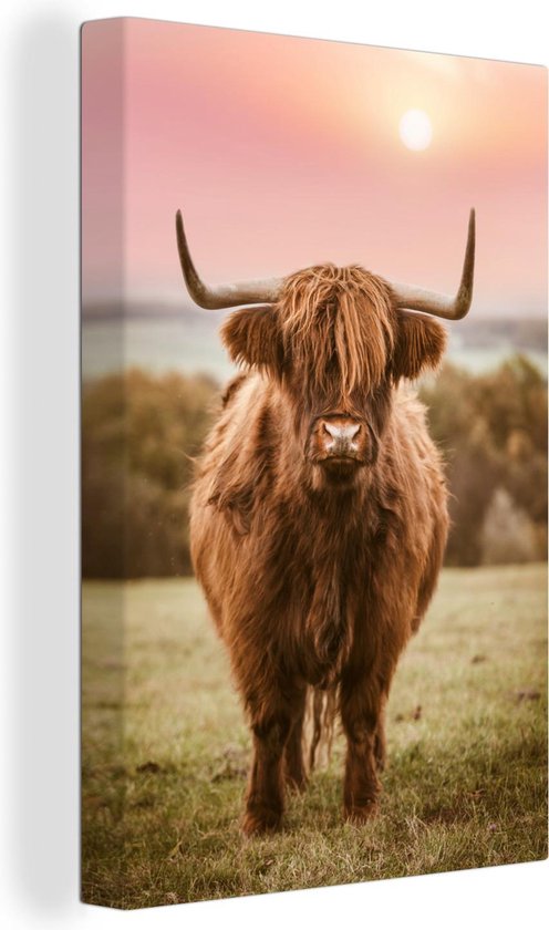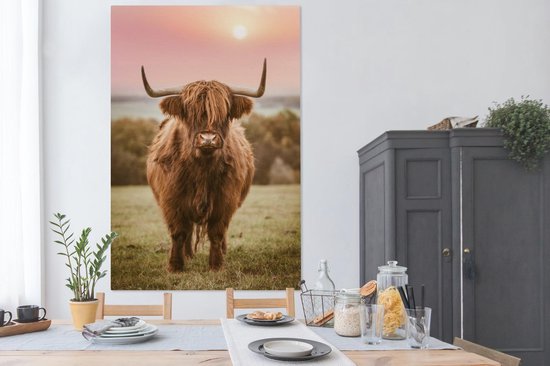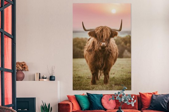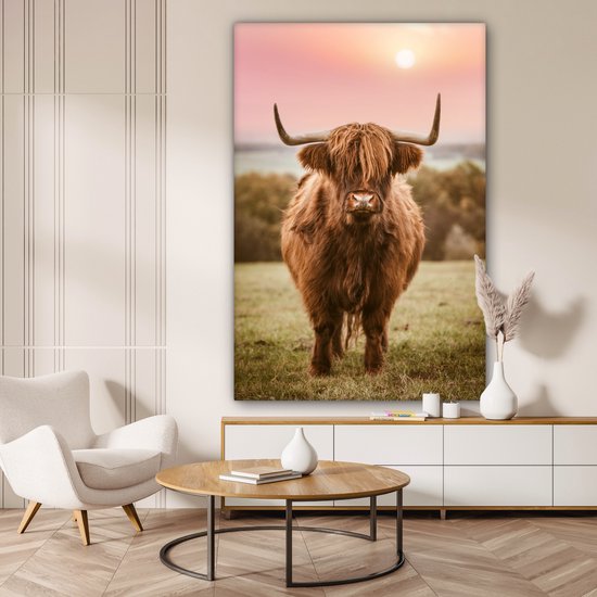 Peintures sur Toile Coucher de Soleil - Animal - Bovins Highland - 120x180 cm - Décoration murale XXL