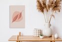Une illustration calme d'une feuille avec une apparence abstraite sur un fond rose pâle. La feuille souffle devant une tache sombre qui ressemble au soleil couchant. Cette image s'intégrera parfaitement à l'intérieur de la chambre.Vaste collection