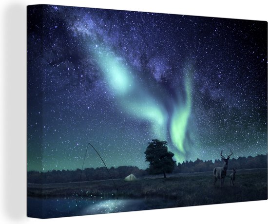Peintures Toiles Aurores Boréales - Ciel Étoilé - Nuit - Cerf - 180x120 cm - Décoration murale XXL