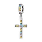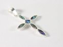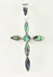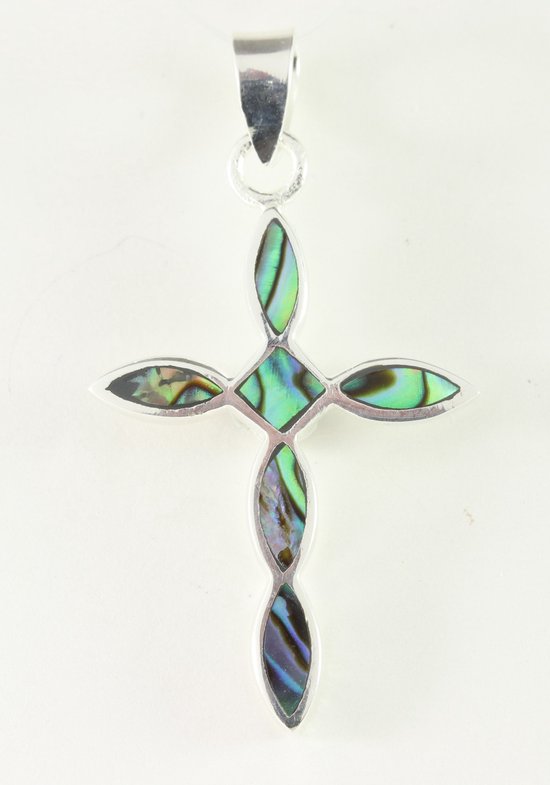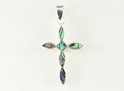 Pendentif croix en argent fin, magnifiquement incrusté de coquille d'ormeau naturelle et colorée. La teneur en argent est de 925.