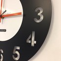 Horloge murale moderne en acier inoxydable dans une laque noire mate vaporisée d'un cercle en acier inoxydable blanc superposé. Equipé d'aiguilles orange frappantes.
