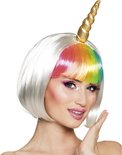 "Perruque licorne blanche et arc-en-ciel pour femme - Cette perruque licorne a une coupe courte et est destinée aux femmes. La perruque synthétique a une frange colorée avec une corne dorée au milieu. La perruque licorne sera parfaite pour parfaire un look fantaisie! "