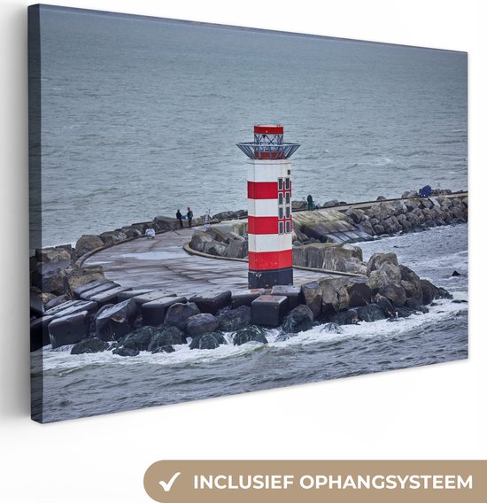 Au bout de cette jetée sur le canal de la mer du Nord se trouve un petit phare. Un certain nombre de personnes sont sur la jetée et pêchent. Le phare rouge et blanc se distingue dans le paysage marin autrement gris. Cette image prend tout son sens dans le salon.