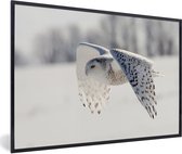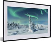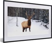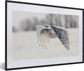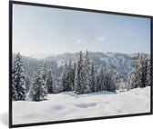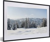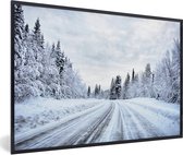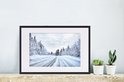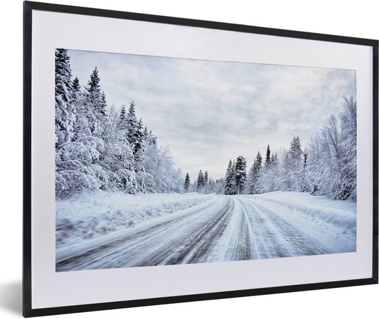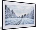 Photo en cadre - Une route enneigée entourée d'un cadre photo paysage d'hiver noir avec passe-partout blanc 60x40 cm - Affiche sous cadre (Décoration murale salon / chambre)