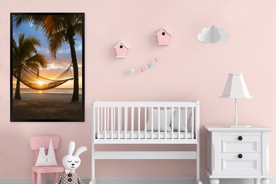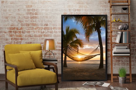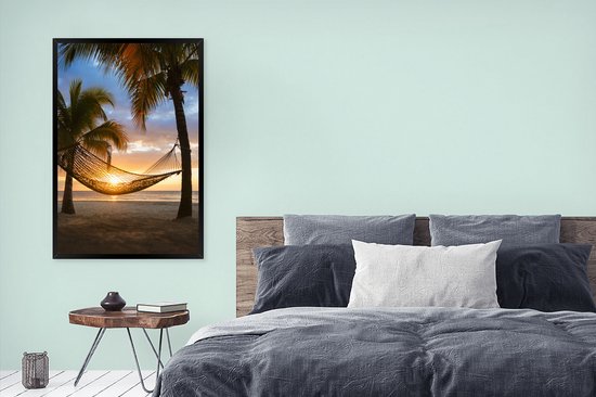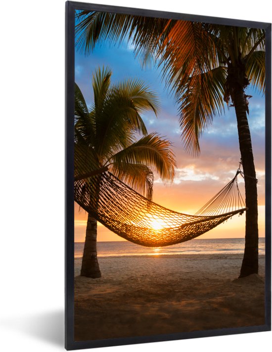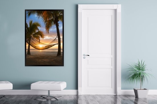 Photo encadrée - Les îles des Caraïbes avec une plage et un hamac cadre photo noir 80x120 cm - Affiche encadrée (Décoration murale salon / chambre) / Mer et plage