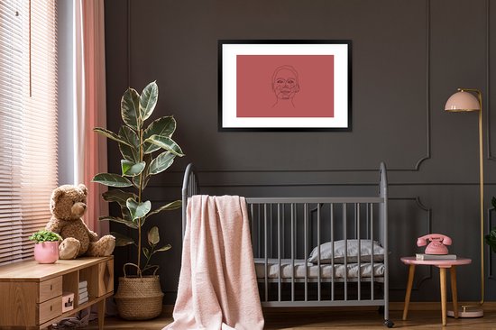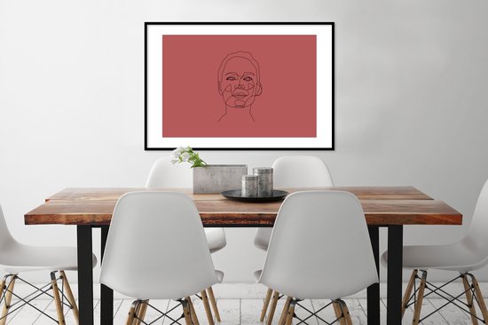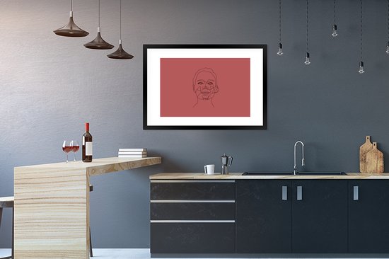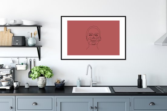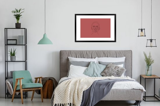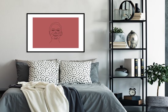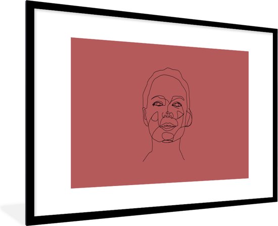Photo encadrée - Line-art visage de femme heureux sur fond rouge cadre photo noir avec passe-partout blanc 60x90 90x60 cm - Poster encadré (Décoration murale salon / chambre)