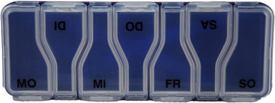 Grâce à sa taille mince d'environ 13,5 × 4,2 × 2,2 cm, le distributeur se glisse facilement dans un sac, un tiroir ou une armoire. Chaque compartiment journalier (environ 2 × 4,2 × 1,7 cm) offre suffisamment d'espace pour les comprimés ou les capsules. La couleur bleue offre un look frais et reconnaissable.