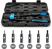 Un outil à riveter de Trailer and Tools au design compact et ergonomique. Construction tout acier et aluminium. Poignée à ressort pour l'éjection automatique du mandrin. Poignée Contour avec revêtement en vinyle pour plus de confort. Les buses sont stockées sur le pistolet pour éviter toute perte. Longueur totale 250 mm. Perfect pour tous les travaux de maison/bricolage. Nous avons également des rivets de différentes tailles et des rivets aveugles en stock.