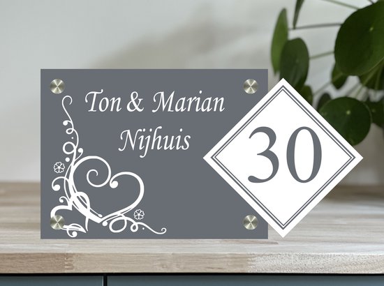 La plaque en plexiglas est de 20x30 avec une plaque supplémentaire pour le numéro de maison, qui est de 10x10 cm. L'impression est en blanc, avec un numéro de maison anthracite.