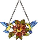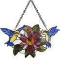 Panneau de verre Tiffany classique rural marron, vert, bleu représentant des oiseaux et une fleur.
