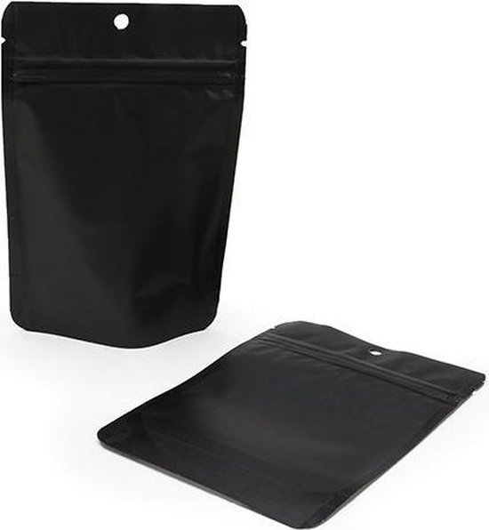 La pochette métallisée avec fermeture à poignée vous offre une barrière de haute qualité résistante aux odeurs et à l'humidité. Cette pochette métallisée noire mate avec fermeture à poignée a un espace utilisable de 9 x 5 x 12 cm et peut transporter environ 57 g de produits secs ou de liquides. En raison de la couleur noire, il crée une apparence unique sur les étagères de vos magasins. Parce que la pochette n'a pas de fenêtre transparente, il y a un espace de 10x15 cm pour avoir le logo de votre entreprise imprimé des deux côtés sur cette pochette. Nos sachets debout ont la propriété d'être hermétiques, refermables et scellables. La conception «autonome» de la pochette debout permet de laisser votre pochette debout remplie d'étagères. Lorsque vous le scellez davantage et qu'il est ouvert plus tard, la pochette peut encore être fermée au moyen d'une fermeture à poignée. Cherchez-vous une pochette de couleur ou de taille différente? Alors jetez un œil à notre large gamme de pochettes stand-up (https: /// sacs / pochettes stand-up - refermables - différentes couleurs et types.html).