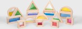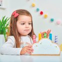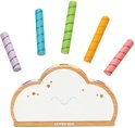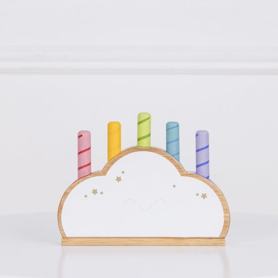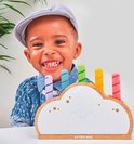 Un nuage en bois avec cinq bâtons pop-up arc-en-ciel colorés (en trois longueurs) et des plumes cachées. Poussez les bâtons colorés dans les ouvertures, laissez-les sauter et essayez de les attraper !