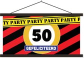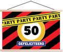 Un panneau routier avec l'âge « 50 » et le texte « Félicitations » forment ensemble une décoration appropriée pour un anniversaire.