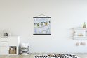 L'affiche textile est imprimée sur une toile robuste avec deux lattes noires en haut et en bas. Une ficelle est attachée aux lattes, de sorte que la commission scolaire puisse être facilement suspendue. Les affiches textiles de TextilePosters sont disponibles dans plus de 25 tailles différentes. En plus des lattes noires, les affiches textiles sont également disponibles avec des lattes en bois blanches ou claires.