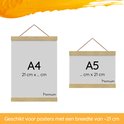 Avec les quatre lattes en bois de 21 cm, vous avez par exemple une manière élégante d'accrocher verticalement une affiche au format A4. Bien sûr, vous pouvez également joindre une affiche plus longue d'une largeur de 21 cm. L'une des deux lattes du haut contient un cordon en cuir solide pour accrocher l'affiche. Les lattes en bas garantissent que l'affiche est bien serrée.