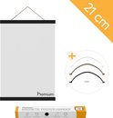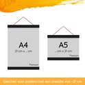 Avec les quatre lattes en bois de 21 cm, vous avez par exemple une manière élégante d'accrocher verticalement une affiche au format A4. Bien sûr, vous pouvez également joindre une affiche plus longue d'une largeur de 21 cm. L'une des deux lattes du haut contient un cordon en cuir solide pour accrocher l'affiche. Les lattes en bas garantissent que l'affiche est bien serrée.